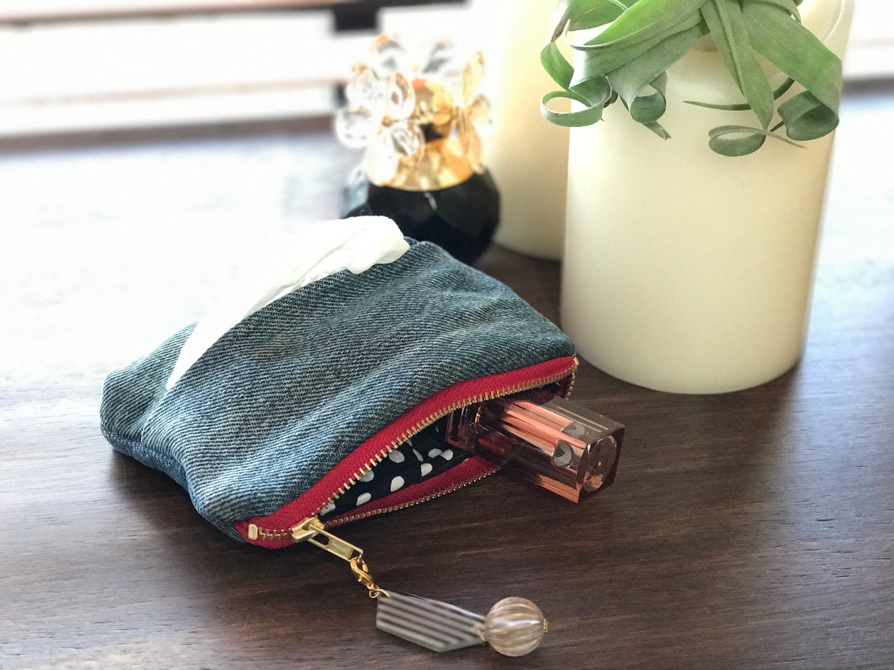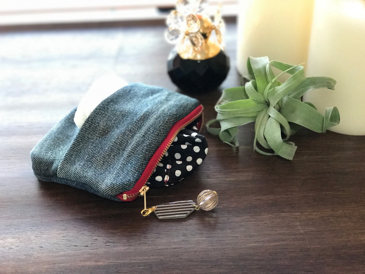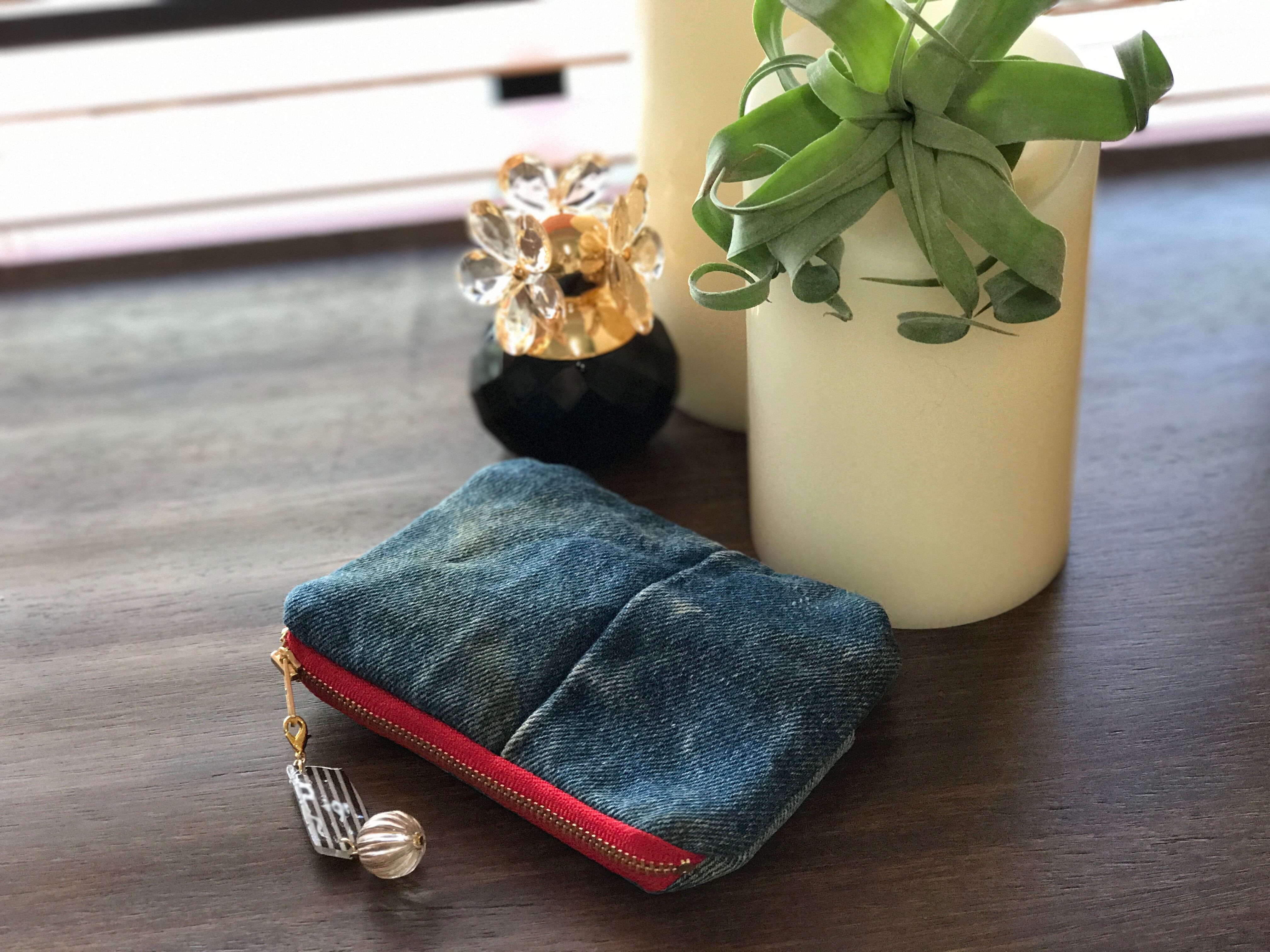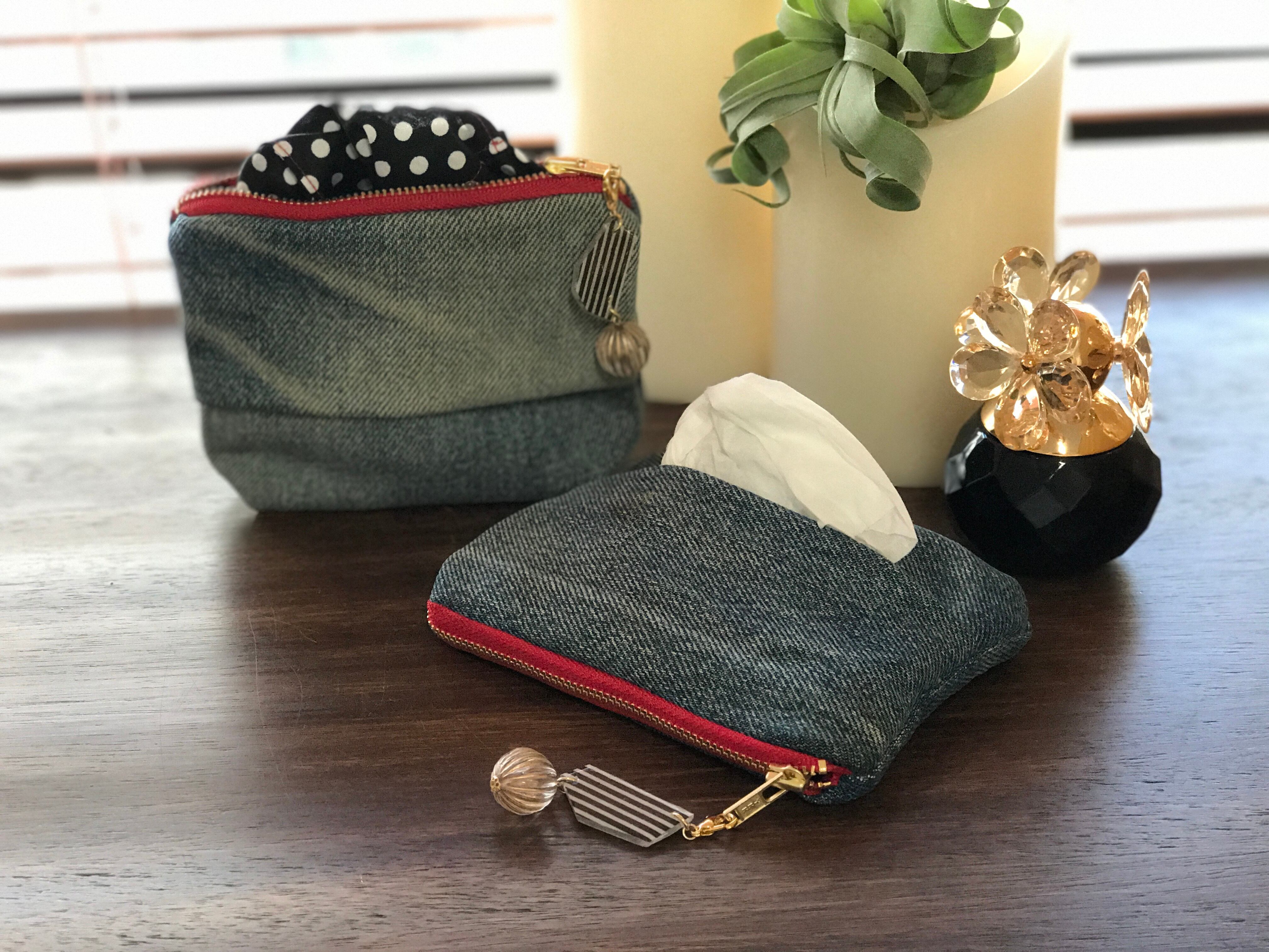 ☆USEDデニムレッドファスナー×ドット☆ポーチ付きポケットティッシュケース